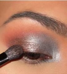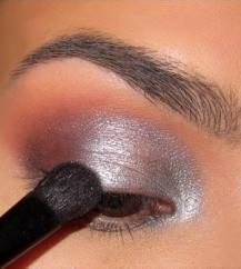 لتضيفي لمسة من الفخامة إلى مكياجك، أضيفي الظلال باللون الفضي الملفت واللّماع إبتداءً من زاوية العين الداخلية وصولاً حتى منتصف الجفن المتحرّك حتى تمتزج قليلاً مع الظلال باللون المشمشي.