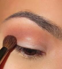 إبدأي أولاً بتطبيق الظلال باللون البيج بدرجة لون داكنة أكثر من لون بشرتك. طبّقي هذه الظلال ابتداءً من وسط الجفن المتحرّك وصولاً حتى خط طية العين والجفن العلوي الثابت.
