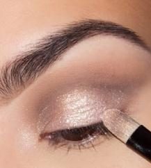 ضعي ظلال العيون باللون البيج اللمّاع بواسطة فرشاة المكياج الصغيرة على الجفن المتحرك وعند زاوية العين الداخلية لتعزيز جمال العين.