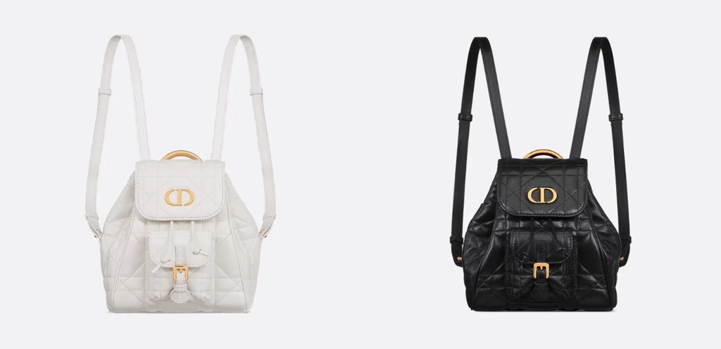 تتميز حقيبة Dior Caro Backpack بتصميمها الأيقوني العصري للغاية، المصنوع من الجلد الناعم، وهي مزينة بالحروف الذهبية “CD” الشهيرة للدار، ومزودة بأحزمة قابلة للتعديل، بالإضافة إلى مقبض معدني ذهبي مزخرف بتوقيع “Christian Dior”.