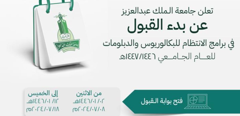 أعلنت عمادة جامعة الملك عبد العزيز عن فتح باب القبول والتسجيل، وكشفت عن آخر موعد لتقديم الطلبات، فتابعي لتعرفي التفاصيل.