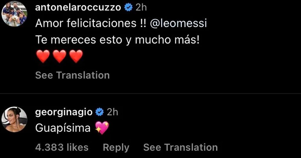 ضمن آلاف التعليقات، علقت جورجينا رودريغيز على منشور أنتونيلا روكوزو بكلمة واحدة قالت فيها:” Guapísima” وهي ما تعني رائعة، وتم تداول هذا التعليق بشكل واسع ولا سيما أن الجماهير مهتمة جدا بتفاصيل حياة كلًا من جورجينا وأنتونيلا، حيث شهدنا تسليط الأضواء بشكل كبير على جورجينا من بداية انتقالها إلى السعودية وحتى الان، فهل تسرق أنتونيلا الأضواء من جورجينا في الفترة المُقبلة!؟