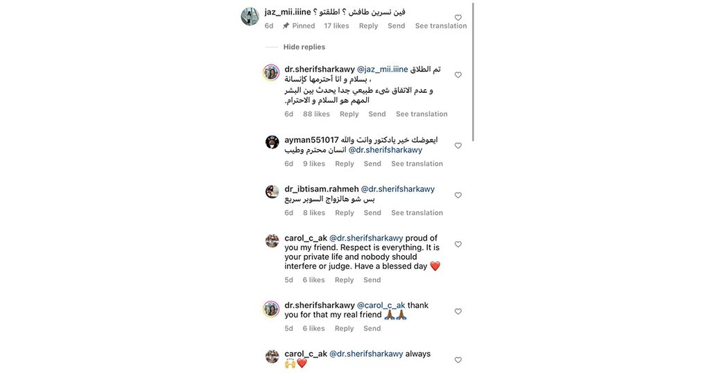 وقد نشر شريف شرقاوي على حسابه الرسمي على إنستغرام مقطع فيديو ظهر فيه من منزله حيث تحدث عن النرجسية والطاقة، مشاركا المتابعين ببعض الامثلة من الواقع ولاقى تعليقات مؤيدة من المنابعين، ولكن وبخطوة غير متوقعة، قام أحد المتابعين بكتابة سؤال ” “فين نسرين طافش؟ اتطلقتوا”، ليرد شرقاوي لاول مرة بشكل واضح على هذا السؤال معلنا الطلاق رسميا، اذ قال: “تم الطلاق بسلام، انا احترمها كإنسانة، وعدم الاتفاق شيء طبيعي جدا يحدث بين البشر، المهم هو السلام والاحترام”.