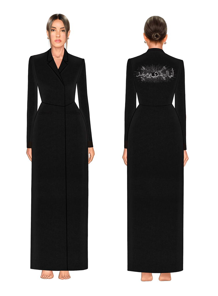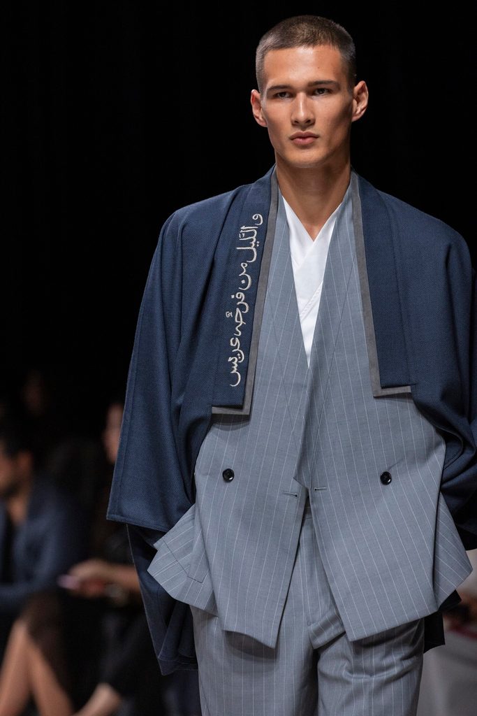 كما دمجت نورا سليمان تصاميم البشت مع البدل العصرية، مع لفتة مميزة للغة العربية مكتوب على البشت لجملة “والليل من فرحة عريس”، لتصاميم تُبرز لمسة أنثوية رائعة حتى مع الموديلات والتصاميم الرجالية، لأناقة ليس لها حدود خصوصًا مع دمج واضح للموديلات الأكثر حداثة وربطها بالتصاميم التي تحافظ على الهوية العربية.