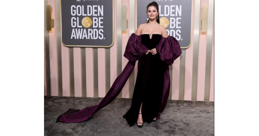 أما النجمة سيلينا غوميز، فقد خطفت الأنظار بإطلالة من فالنتينو بحيث إختارت فستان مُخملي باللونين الأسود والبنفسجي الذي أكملته بحذاء بتصميم بلاتفورم.