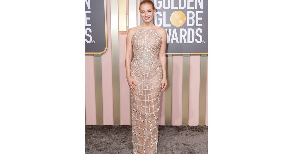 بفستان من ماركة الأزياء العالميّة أوسكار دي لارنتا، تألقت النجمة جيسيكا تشاستين بفستان شفاف فضي الذي يتميز بموديل الشبك المميز.