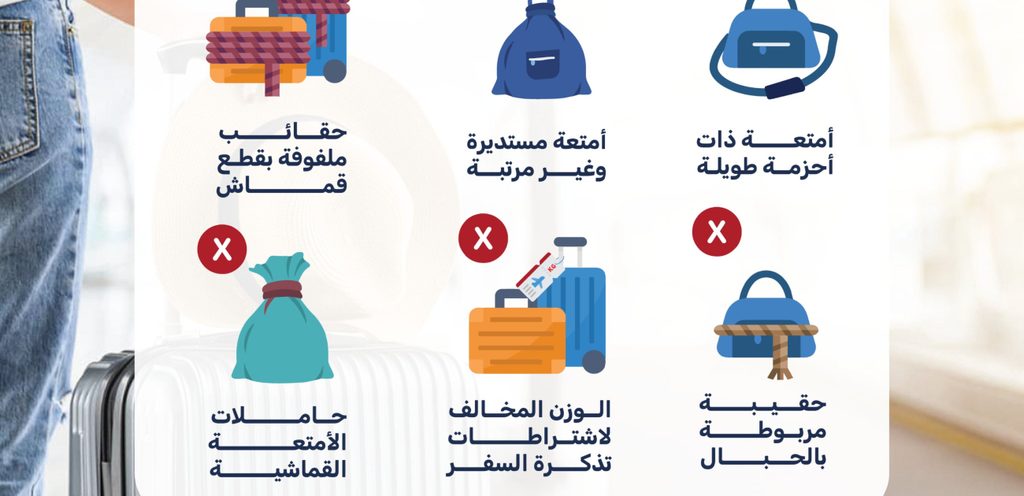 كشف مطار الملك عبد العزيز الدولي عن 6 أنواع من الأمتعة التي لا يُسمح للركاب السفر بها، وذلك في سبيل توعية المسافرين المغادرين من المطار، وتحذيرهم للسفر بكل سلاسة وسهولة، وتفادي ضياع الوقت والمال، وهذه الأمتعة هي: