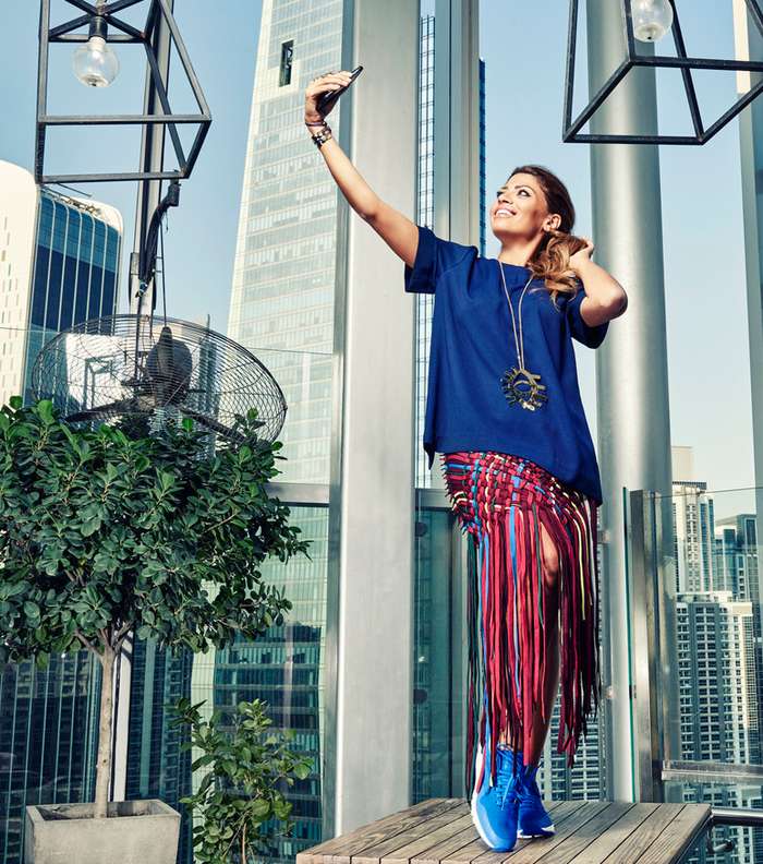 الحذاء Rocherun الرياضي من نايكي مع فستان سهرة من تصميم Caroline Seikaly وبليزر بأكمام مطبّعة بنقشة الـ Tribal من تصميم Lady Fozaza وكلاتش من Nathalie Trad, وأقراط وخواتم من الذهب والماس من Bilarabi وسوار من تصميم العنود بالتعاون مع مجوهرات لازودي. "أحب تنسيق الحذاء الرياضي مع مختلف الأزياء لإطلالة عفوية وطبيعية!"