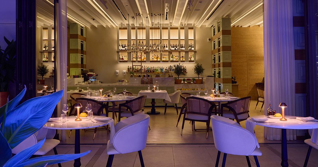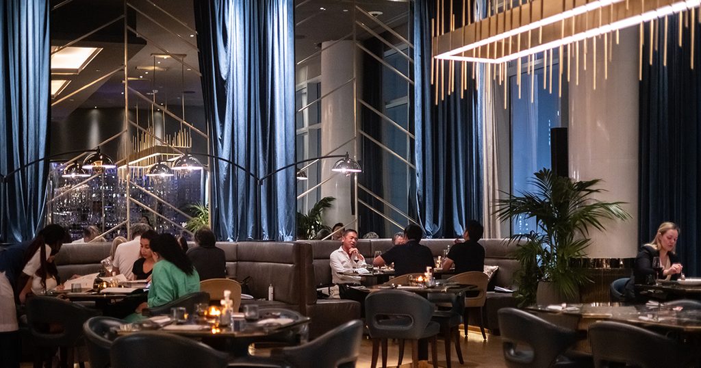 إذ يحلو الاستمتاع بعشاء رومانسي لشخصَين بين حنايا المطعم الخلّاب فيما تلوح في الخلفية أبراج وسط المدينة المتلألئة.