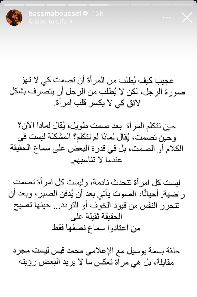 “ليست كل امرأة تتحدث نادمة، وليست كل امرأة تصمت راضية”، كانت هذه الكلمات التي نشرتها بسمة لتعبّر عن مشاعها تجاه الانتقادات التي تواجهها.