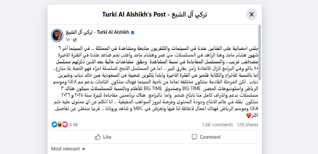 جاء هذا الإعلان على خلفية كشف تركي آل الشيخ عن الأسماء المتصدرة في عالم الدراما والسينما، حيث قال عبر منشورة على منصة “فيسبرك”:” في السينما آخر ٦ شهور هشام ماجد وهنا الزاهد وفي المسلسلات مي عمر وهشام ماجد وأعلى نجم صاعد عندنا في الفترة الأخيرة مصطفى غريب”.