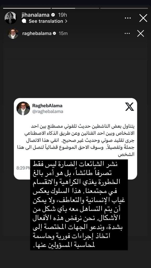 بعد تداول فيديو مكالمة هاتفية بصوت السوبر ستار راغب علامة باستخدام الذكاء الاصطناعي مع عبد الله بالخير، خرجت جيهان علامة، عن صمتها لتدافع عنه وتؤكد براءته.