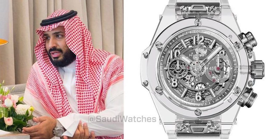 ضمن الساعات الكثيرة التي يرتديها ولي العهد في مناسباته، أعجب الكثيرون بذوقه حين ارتدى ساعة هوبلو Big Bang Unico المصنوعة من الياقوت، والتي بدت في غاية الفخامة والأناقة، ويبلغ سهر هذه الساعة 70 ألف دولار أمريكي.