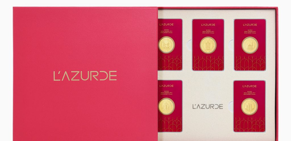 بصندوق أحمر اللون نُقش عليه شعار علامة لازوردي، تتمركز خمس قطع من الذهب الخالص تم إطلاقها خصيصًا للإحتفال باليوم الوطني السعودي، ونُقش على العملات الذهبية بدقة وحرفية عالية رموز تدل على أبرز مناطق ومدن المملكة، والتي هي: مكة المكرمة، والمدينة المنورة، والرياض، وجدة، والدمام.