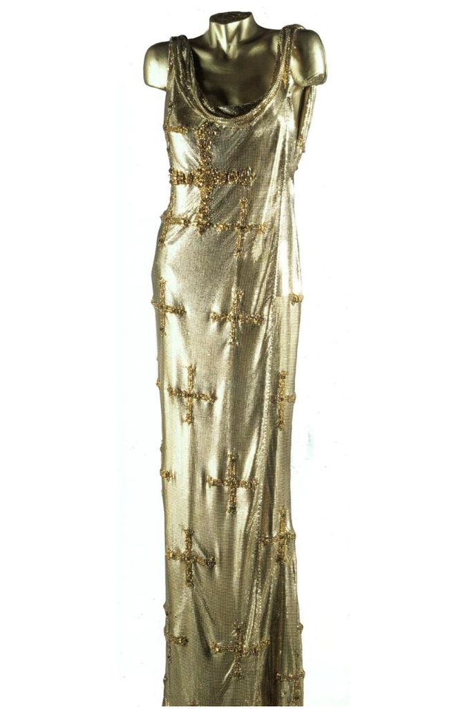 يعتبر هذا الفستان من أكثر القطع شهرة في تاريخ دار فيرساتشي Versace، فهو يتميز بشبك المعدن الذي تم ابتكاره خصيصًا من قبل فيرساتشي عام 1982.