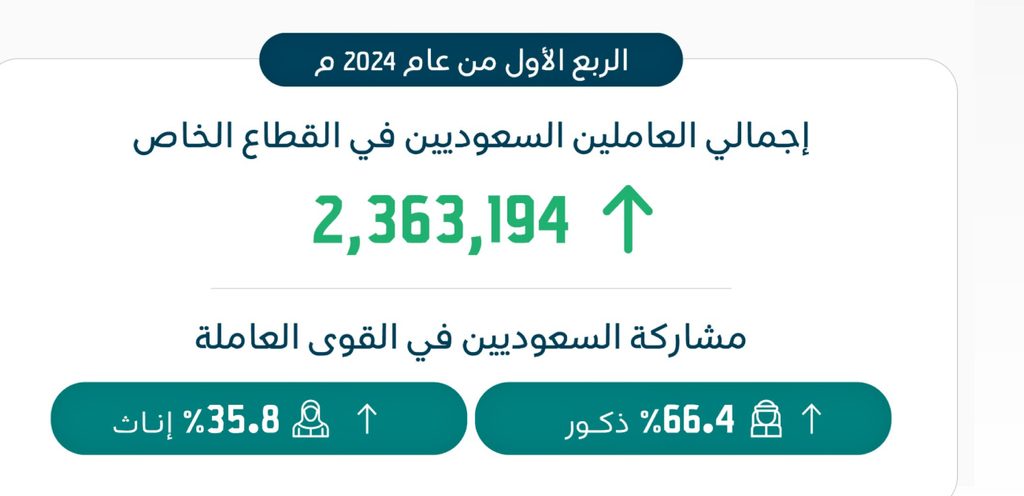 وتفصيلًا ظهر في المؤشرات ارتفاع معدّل المشاركة في القوى العاملة لإجمالي السعوديين في الربع الأول من عام 2024 ليُصبح 51.4% بعد أن كان 50.4% في الربع السابق، كما انخفض معدل البطالة لدى السعوديين الذكور في الربع الأول من عام 2024م إلى 4.2% بعد أن كان في الربع السابق 4.6%.