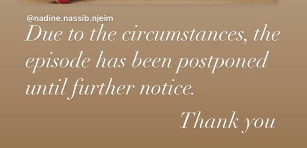 في تفاصيل إعلان التأجيل، أعادت نادين نشر صورة الحلقة، مع تعليق قالت فيه:” نظرًا للظروف، تم تأجيل الحلقة حتى إشعار آخر، شكرًا لكم”. وسرعان ما تحول اسم نادين نجيم إلى سوشيل ترند ليتصدر قائمة أبرز أخبار المشاهير في مصر والعالم العربي.