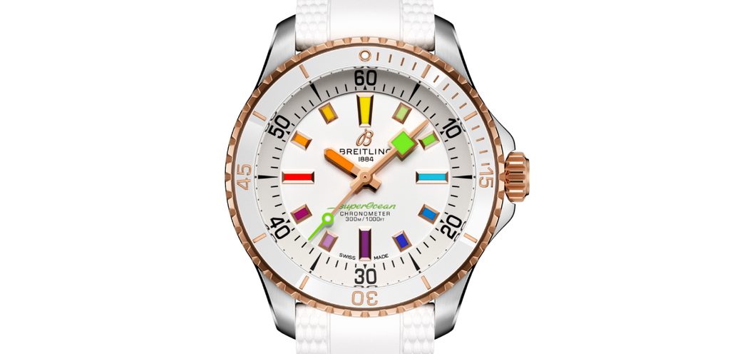 تتميز سوبر أوشن أوتوماتيك 36 بموديلات ميناء فريدة بألوان قوس قزح، مما يجعلها خيارًا مثاليًا لإطلالات الصيف، مع عقارب ومؤشرات ساعات مطلية بـ Super-LumiNova®، تتوهج الساعة بألوان جميلة في الظلام، ما يضيف لها لمسة من الجمال والمرح.